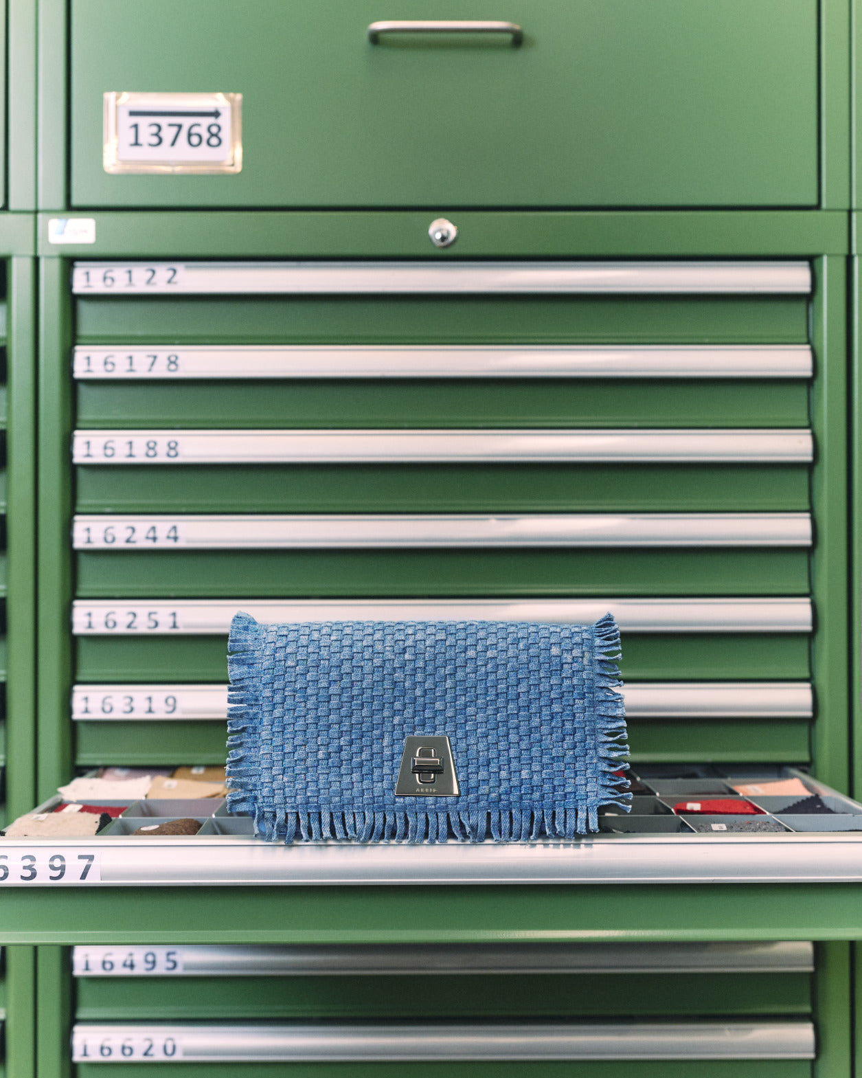 Als Kind verbrachte Creative Director Albert Kriemler unzählige Nachmittage damit, Stoffproben zu beschriften. Einige dieser Muster liegen noch immer in diesen grünen Schubladen – heute die Kulisse für eines seiner liebsten Materialien: japanischen Denim.