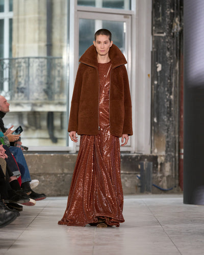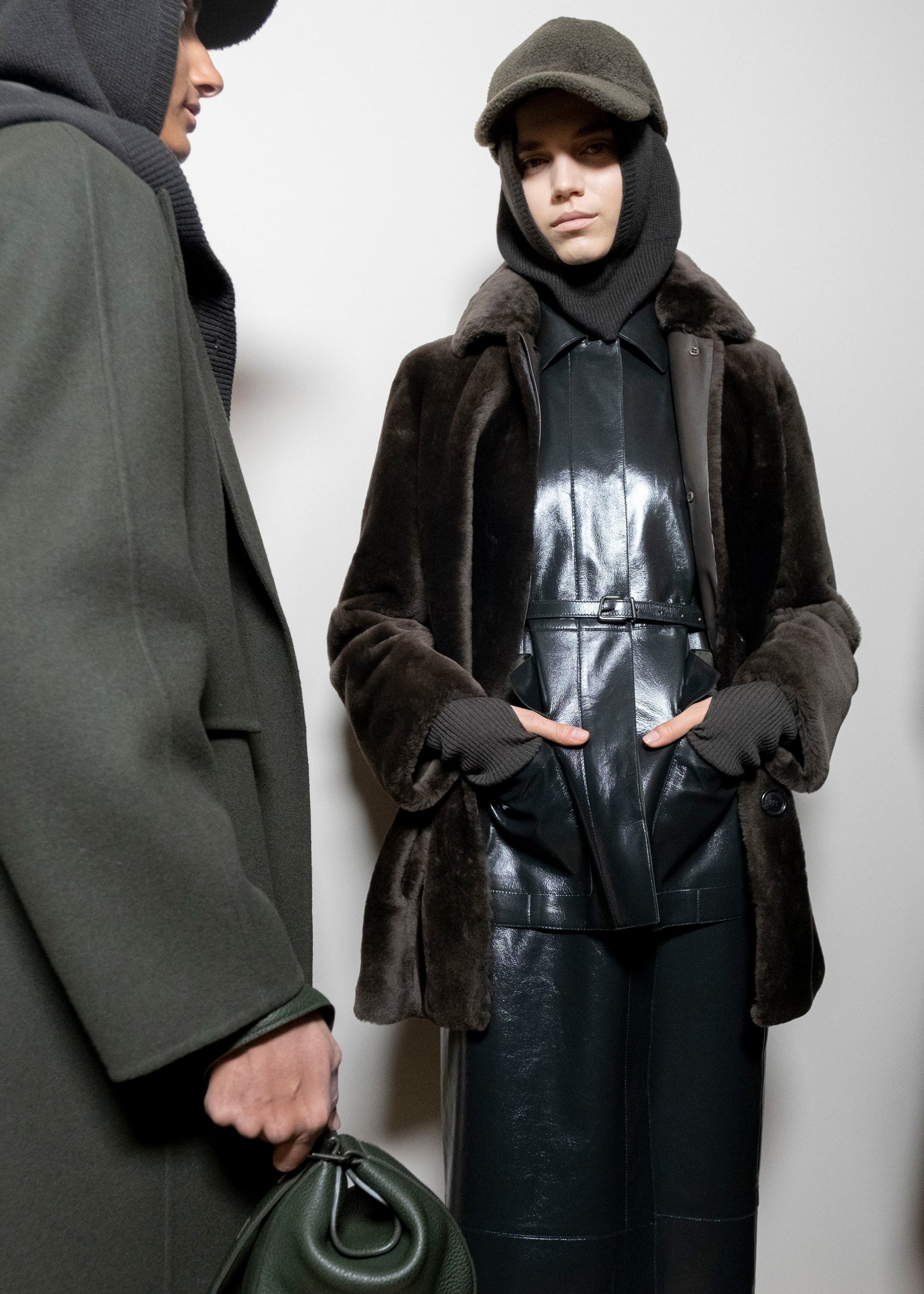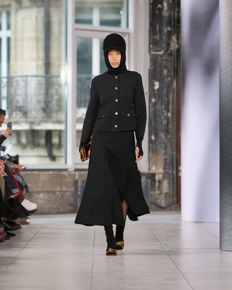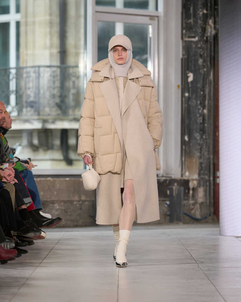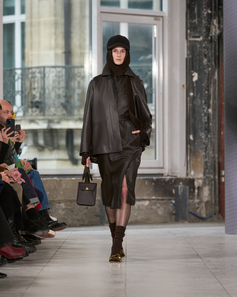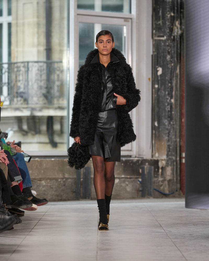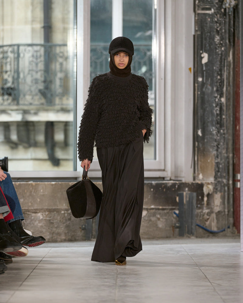 Texture echoes opposition. Knits in cloud, felted, and bouclé cashmere are sumptuous of touch and feel. There is pragmatism in cotton gabardine. Caress in shearling. Preciousness in a wavy lined corset. Lacquered leather and lace. Weightless organza.