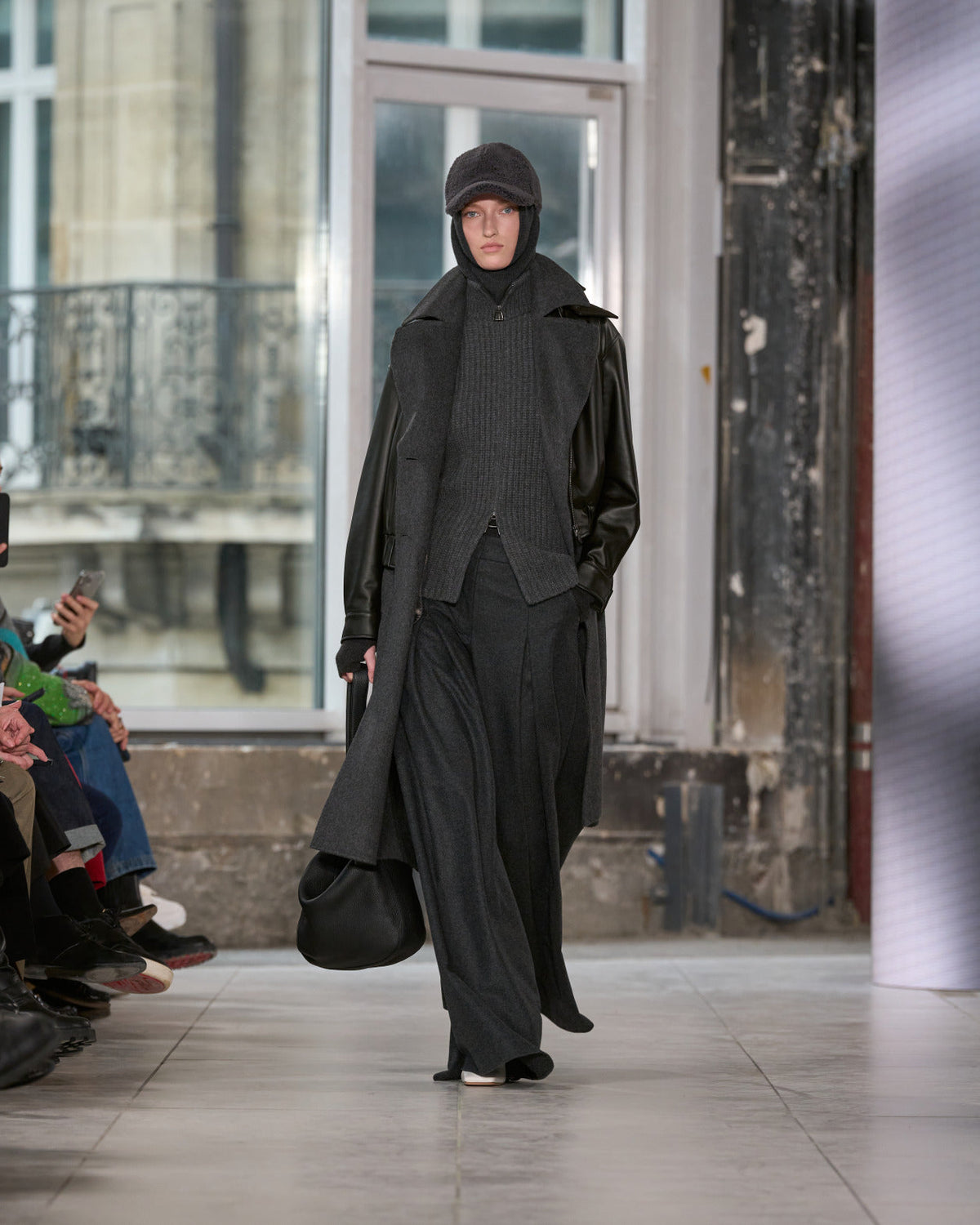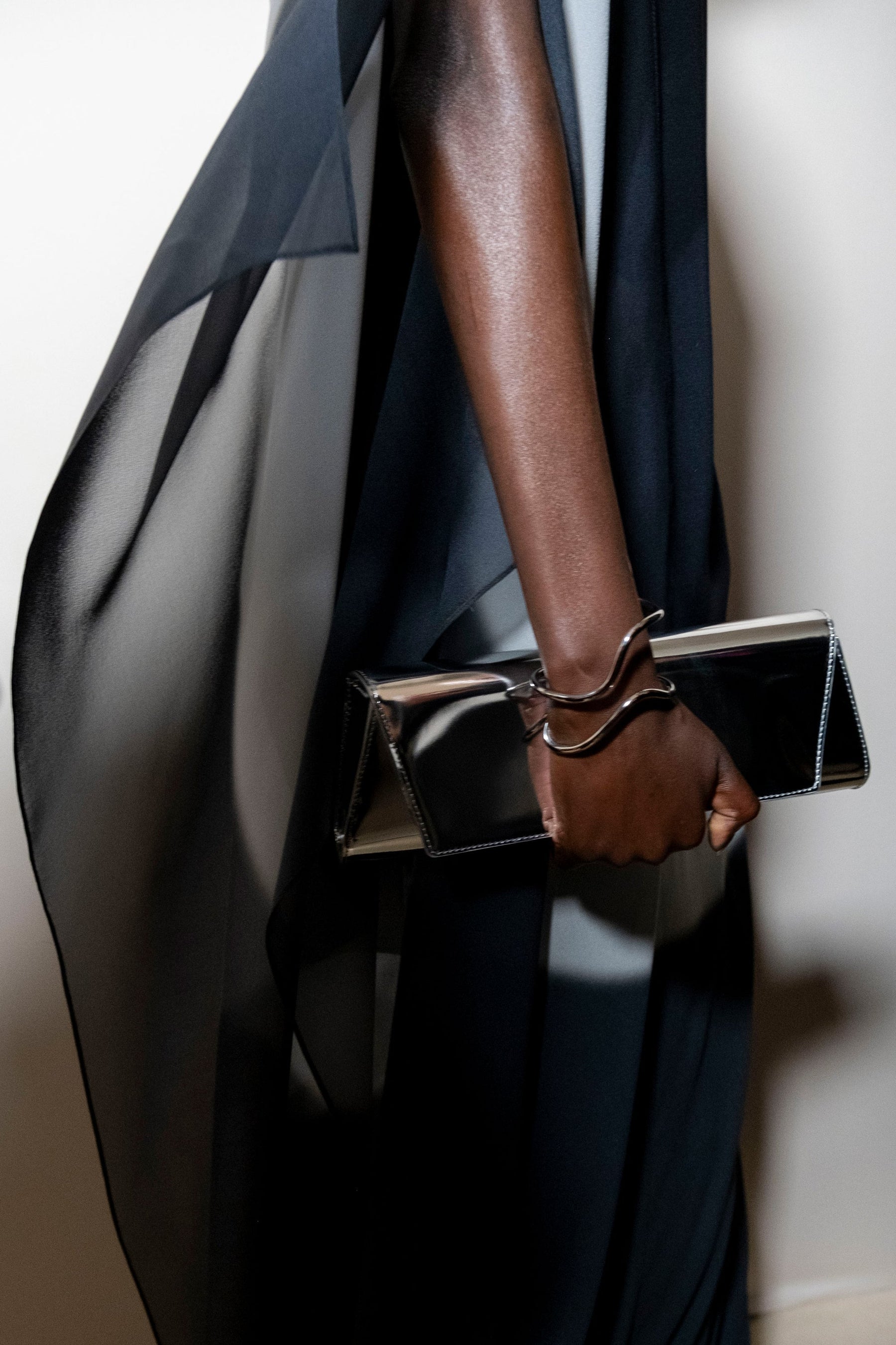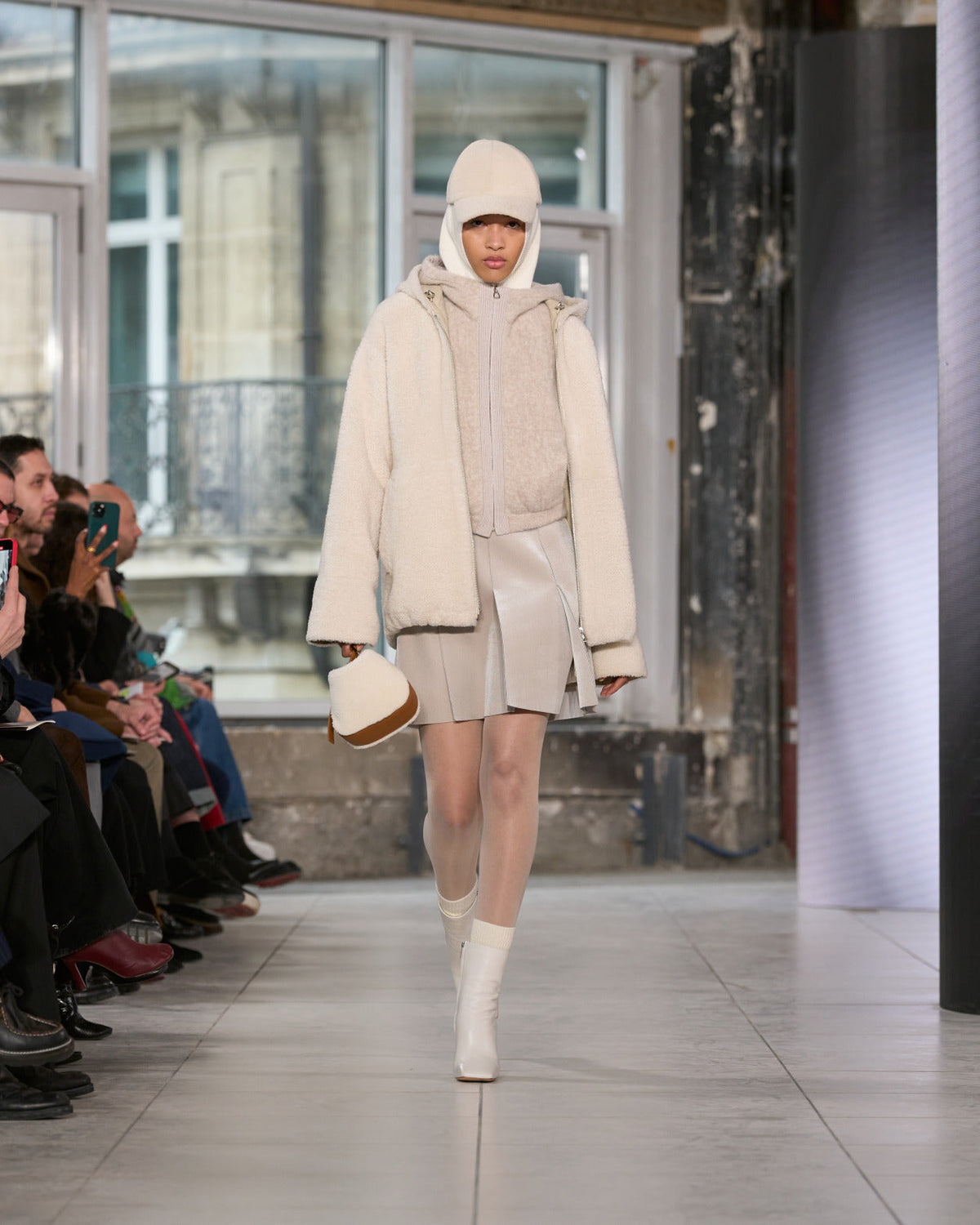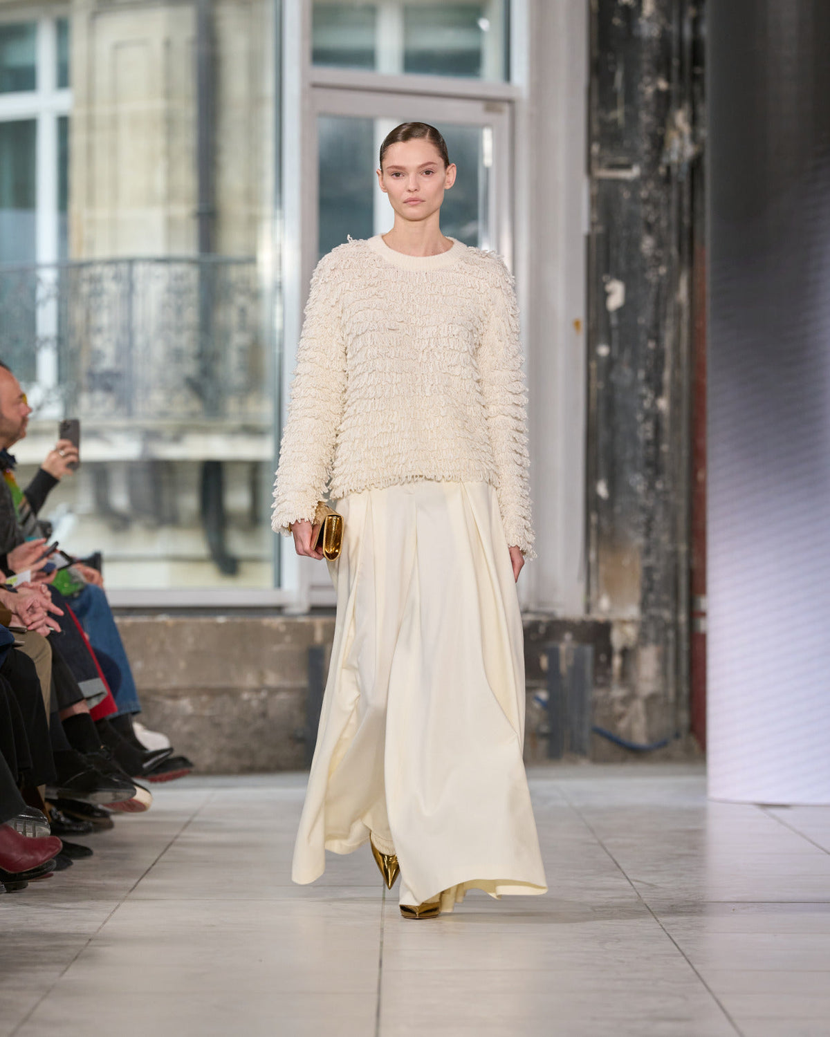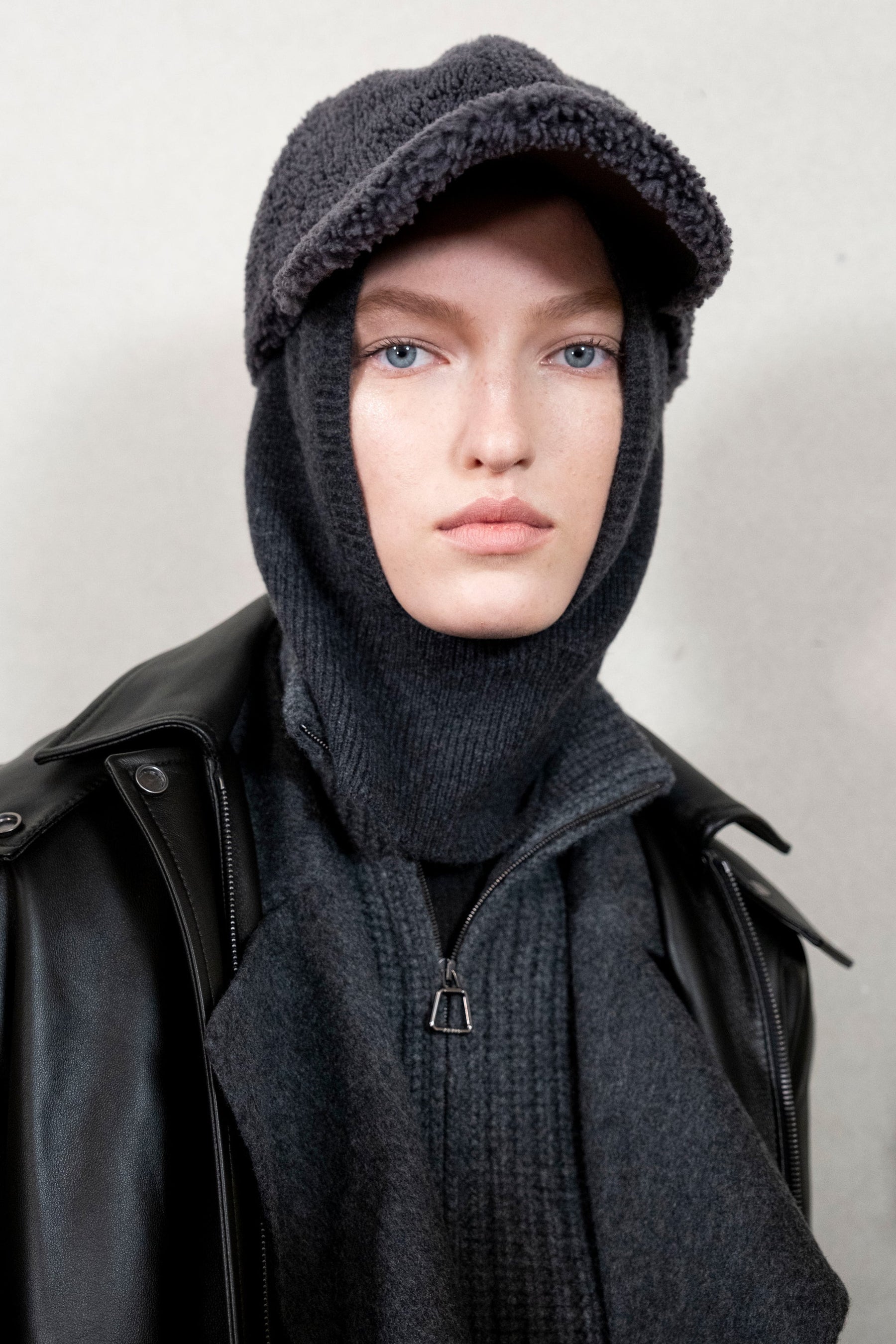 Texture echoes opposition. Knits in cloud, felted, and bouclé cashmere are sumptuous of touch and feel. There is pragmatism in cotton gabardine. Caress in shearling. Preciousness in a wavy lined corset. Lacquered leather and lace. Weightless organza.