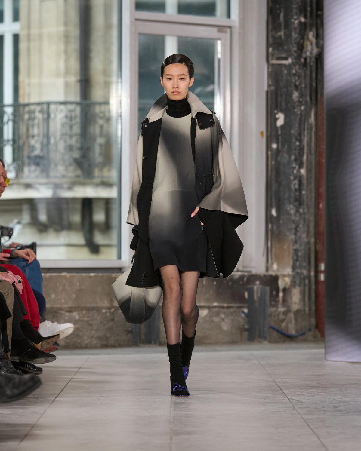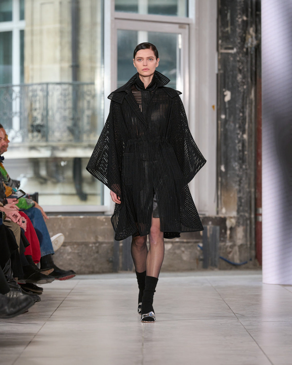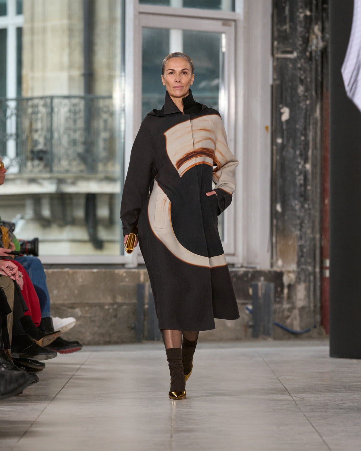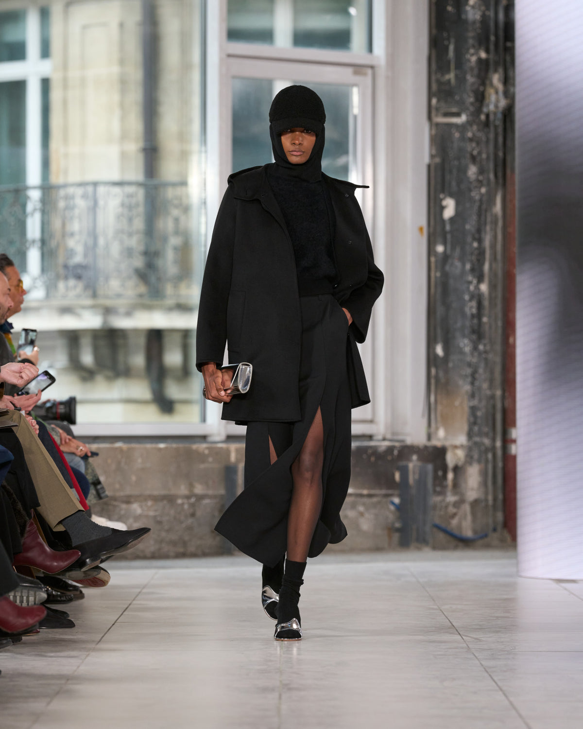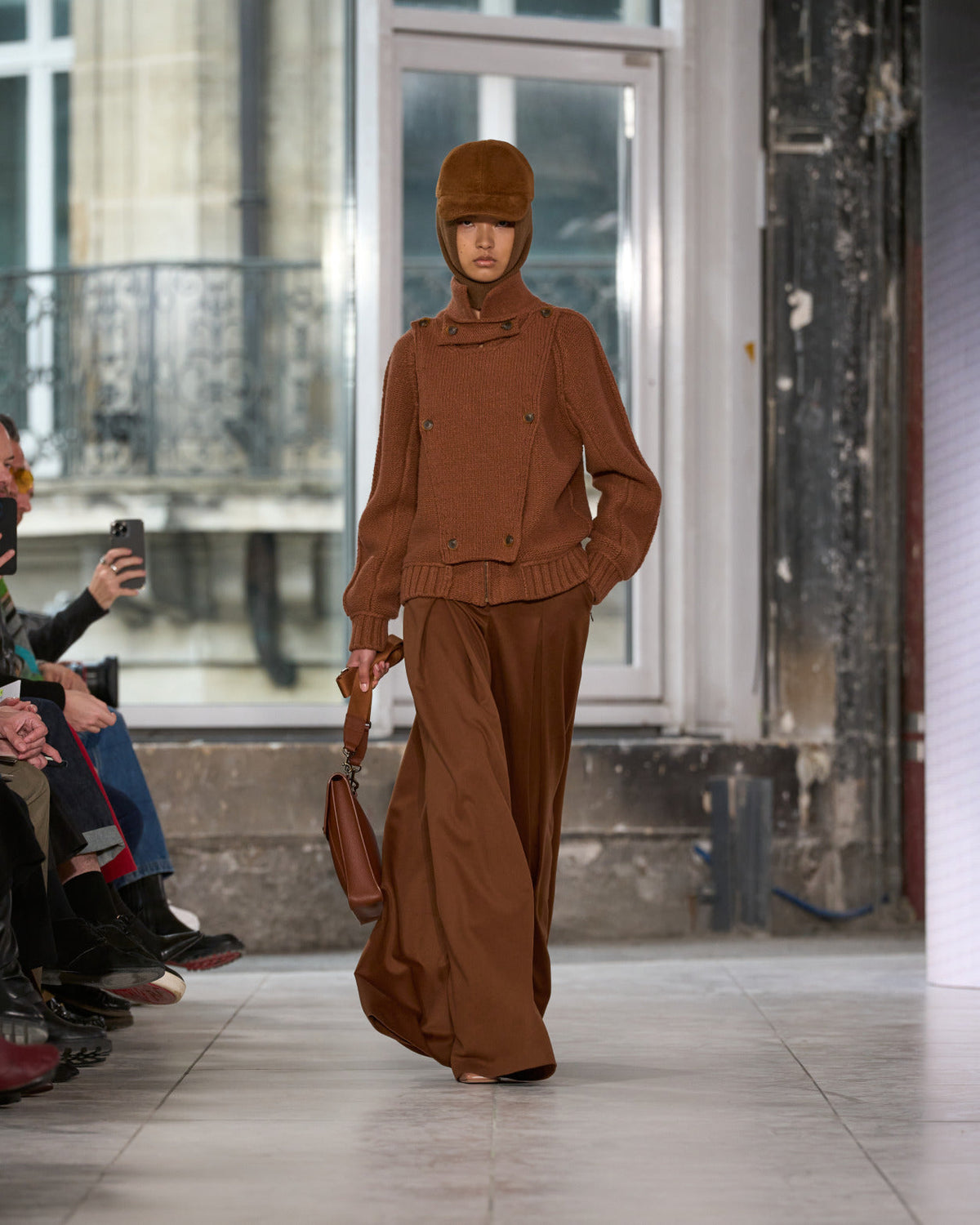 Texture echoes opposition. Knits in cloud, felted, and bouclé cashmere are sumptuous of touch and feel. There is pragmatism in cotton gabardine. Caress in shearling. Preciousness in a wavy lined corset. Lacquered leather and lace. Weightless organza.