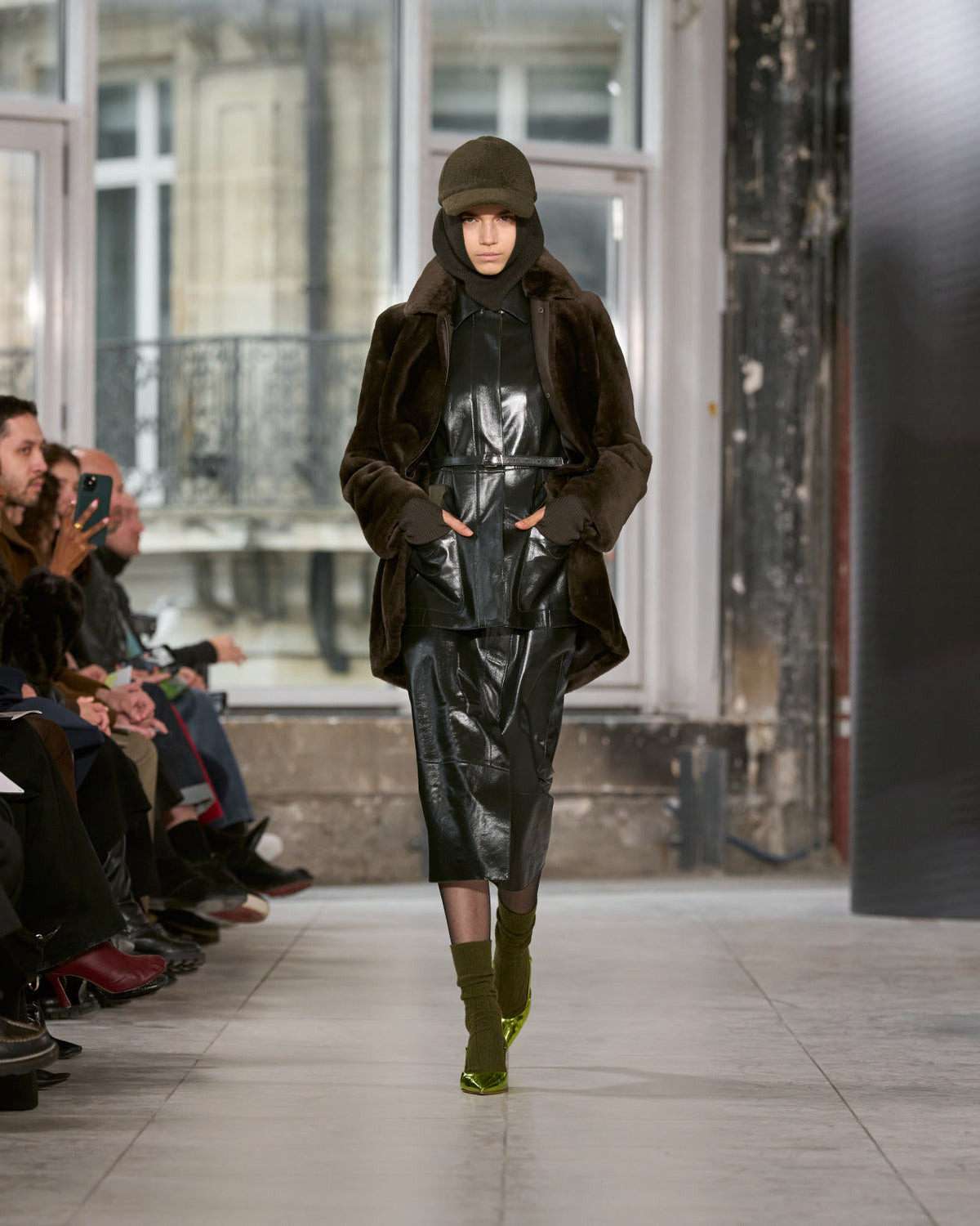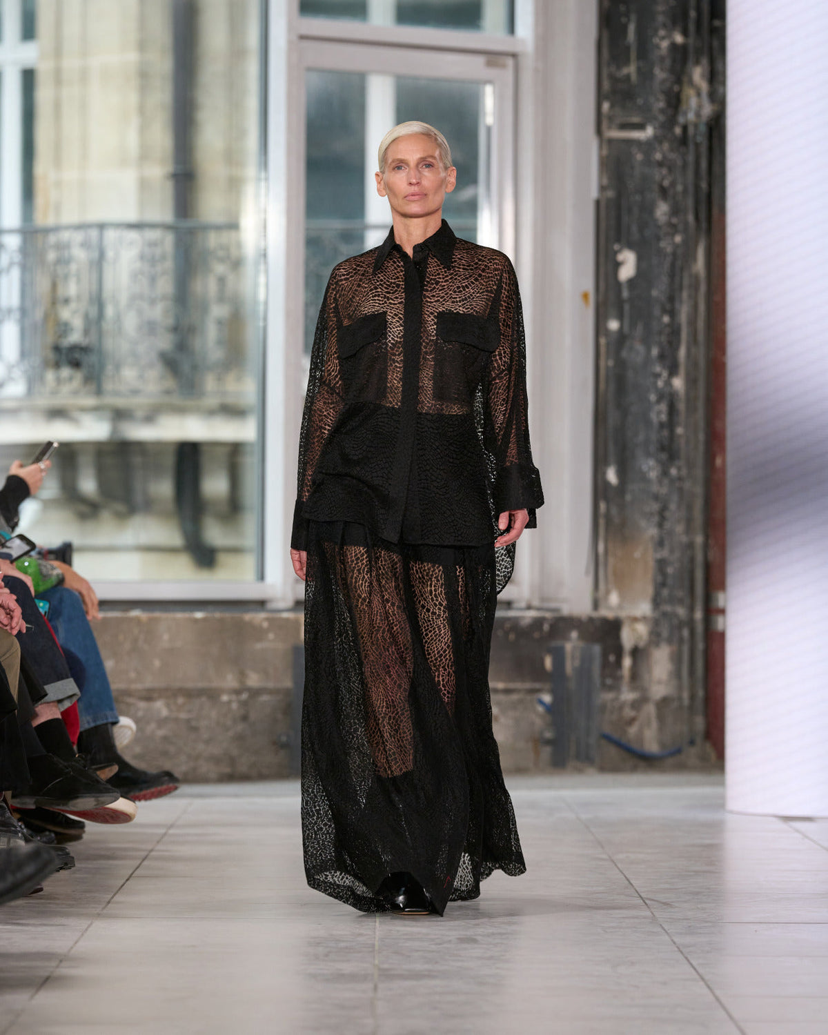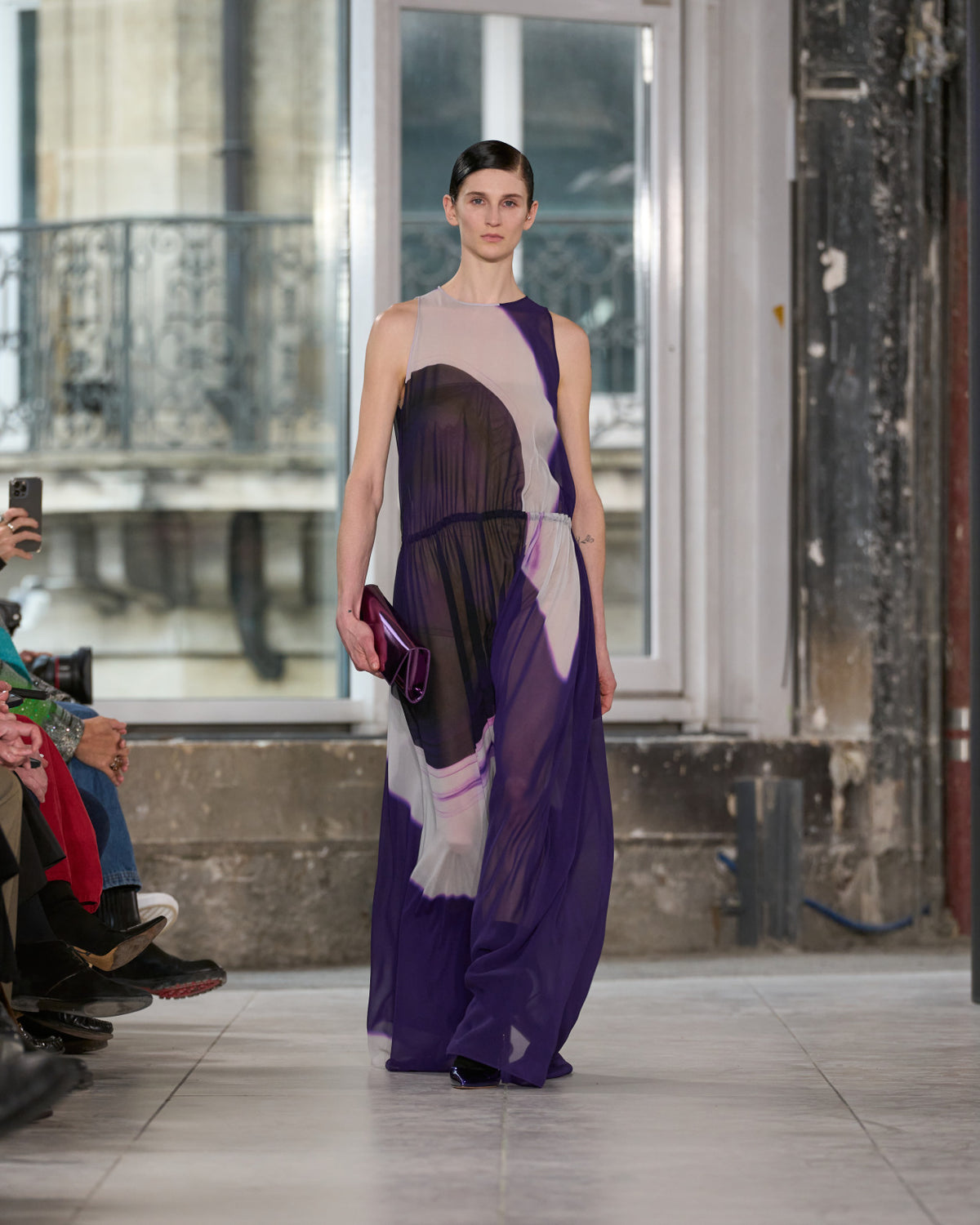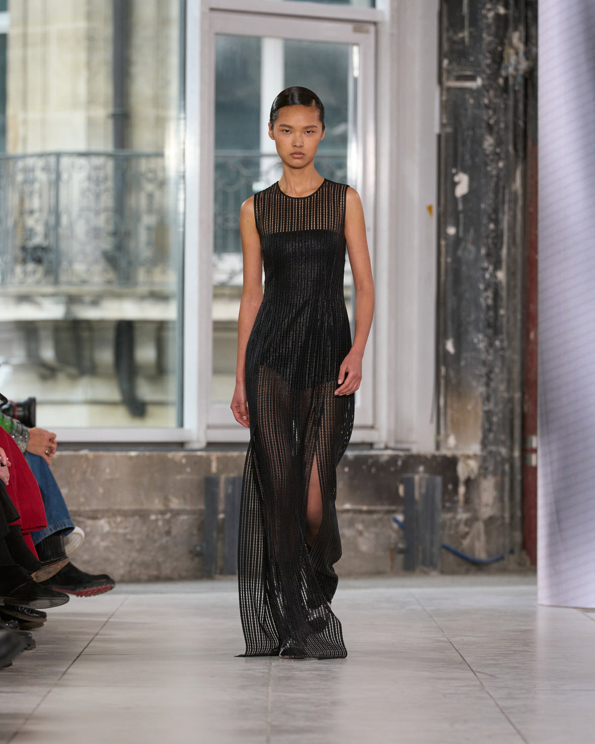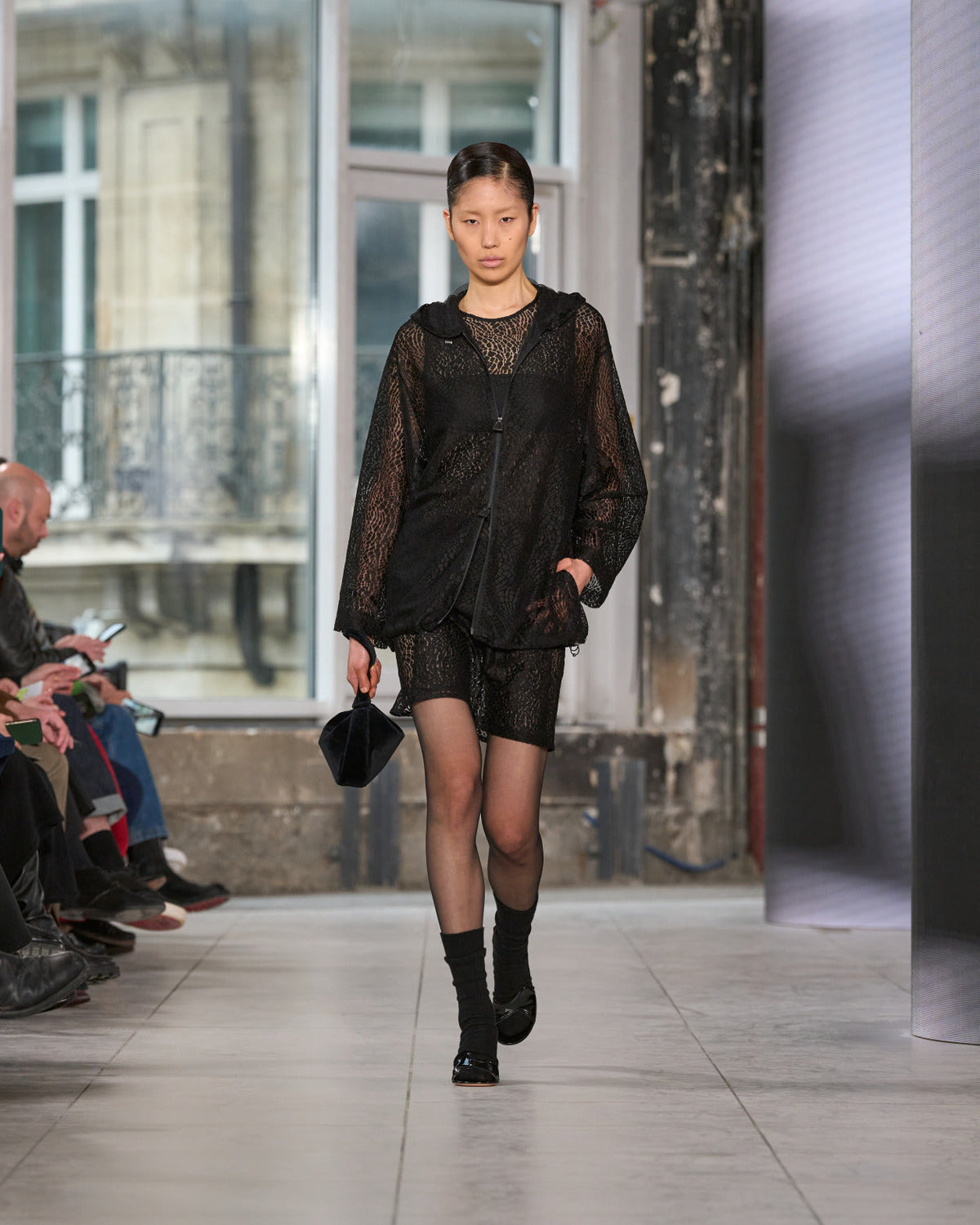 Texture echoes opposition. Knits in cloud, felted, and bouclé cashmere are sumptuous of touch and feel. There is pragmatism in cotton gabardine. Caress in shearling. Preciousness in a wavy lined corset. Lacquered leather and lace. Weightless organza.