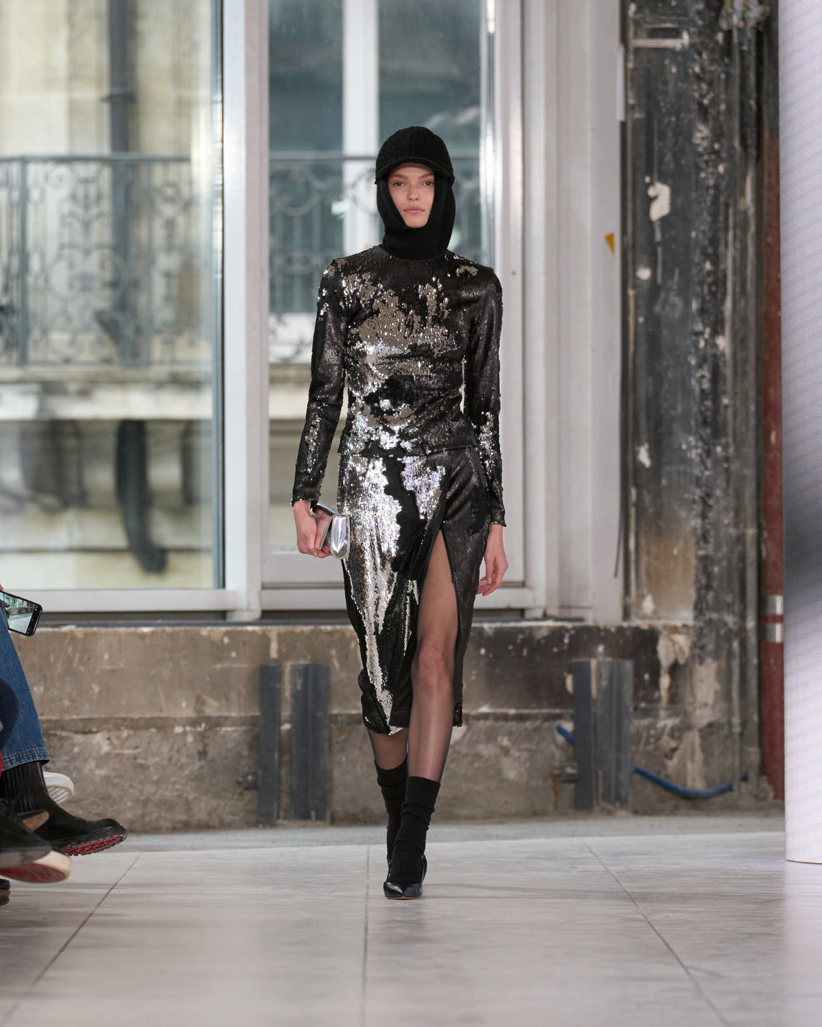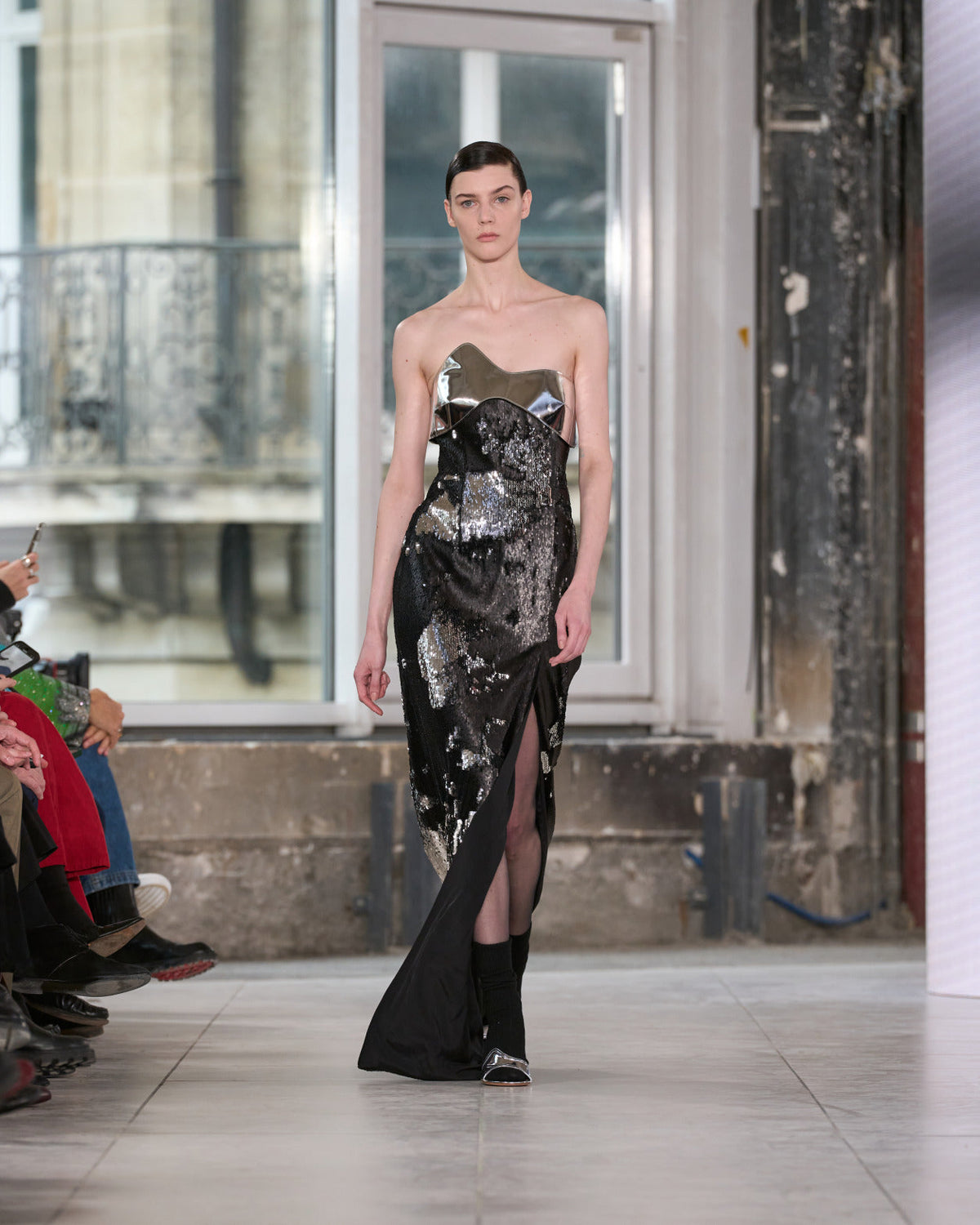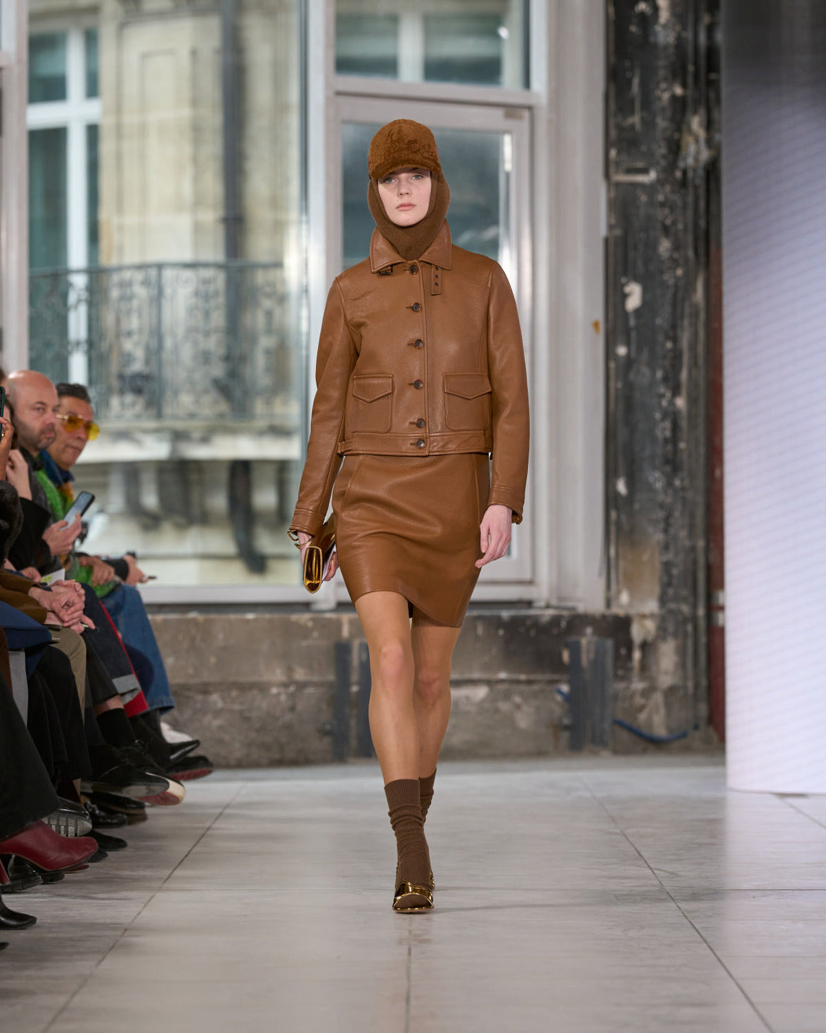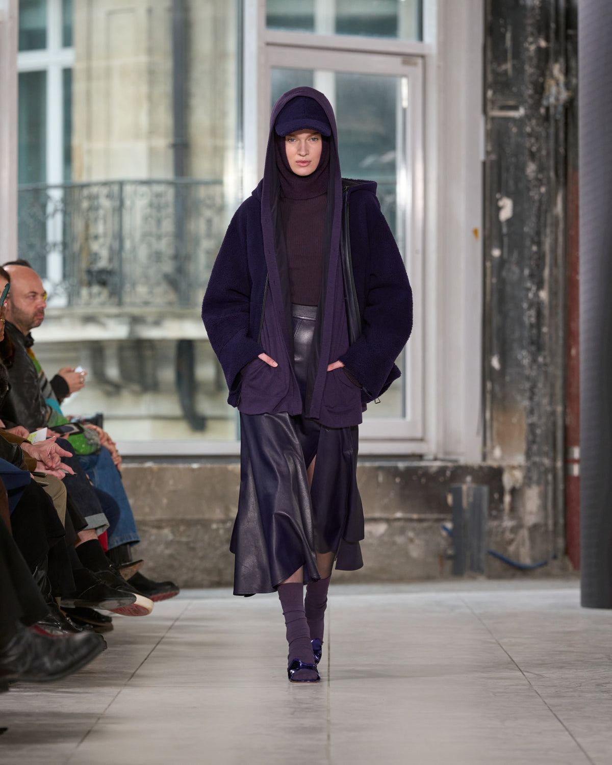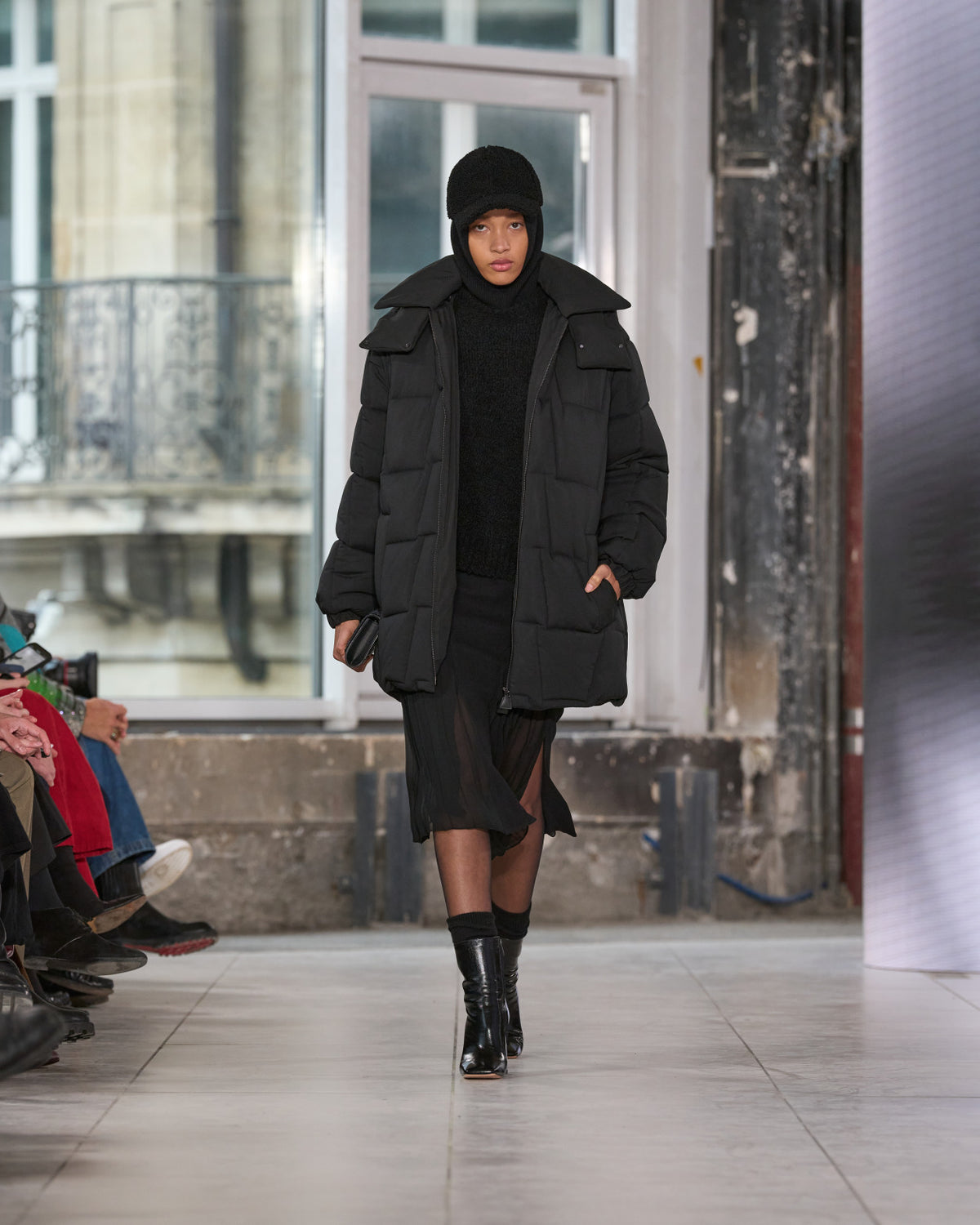 Texture echoes opposition. Knits in cloud, felted, and bouclé cashmere are sumptuous of touch and feel. There is pragmatism in cotton gabardine. Caress in shearling. Preciousness in a wavy lined corset. Lacquered leather and lace. Weightless organza.