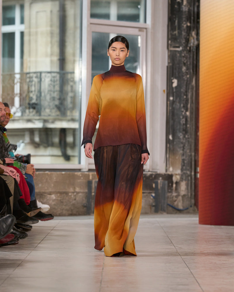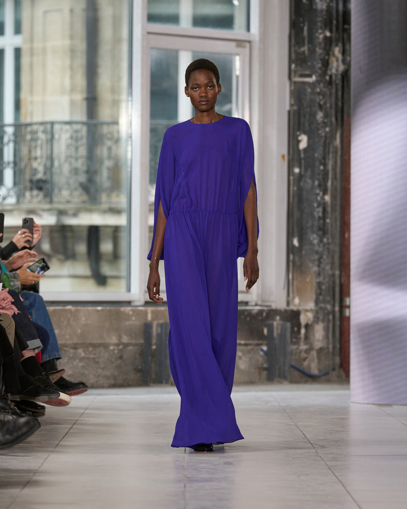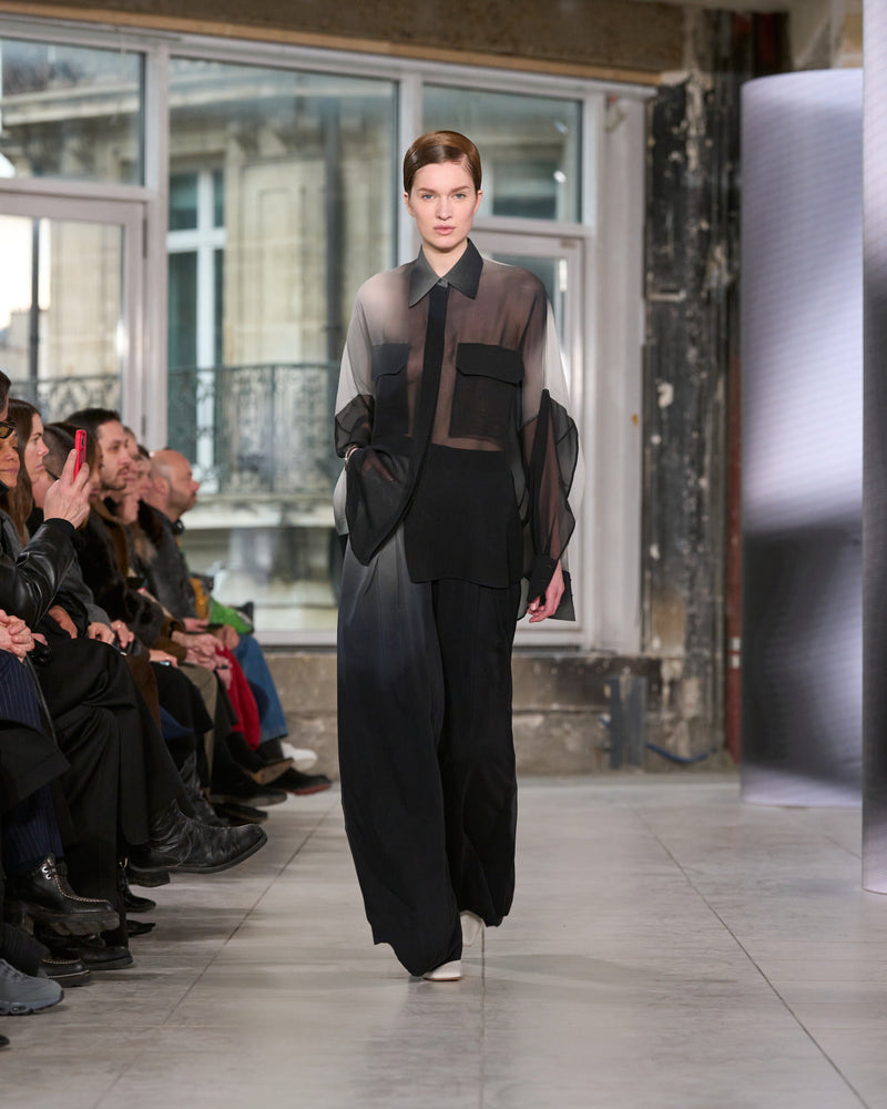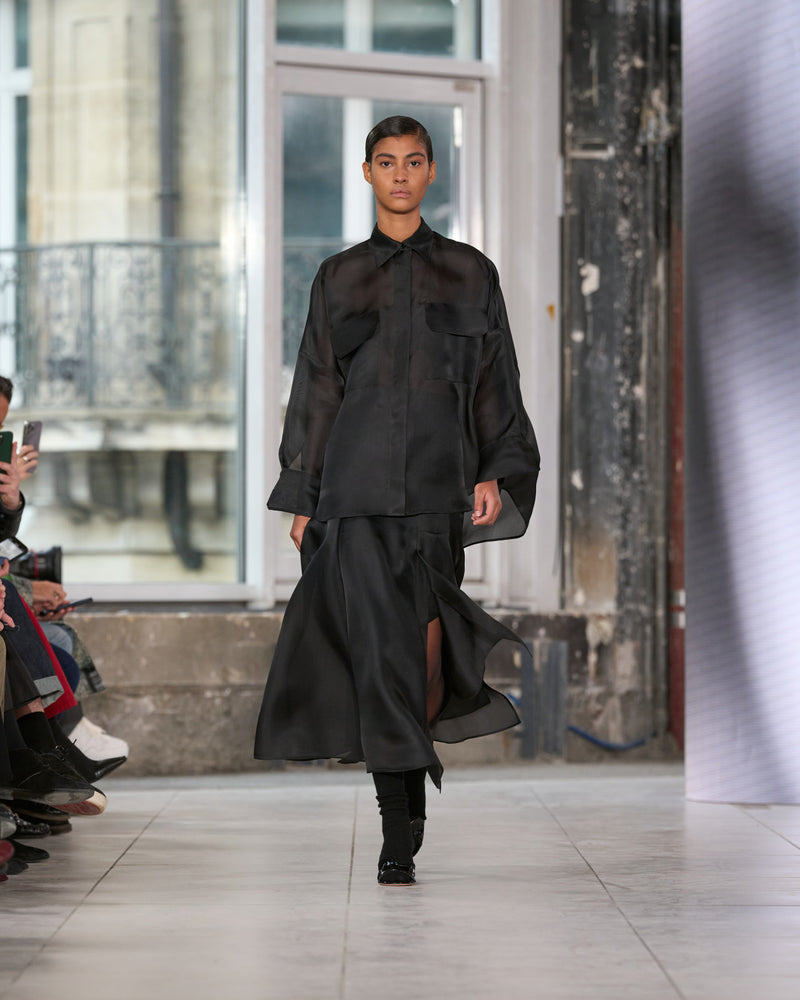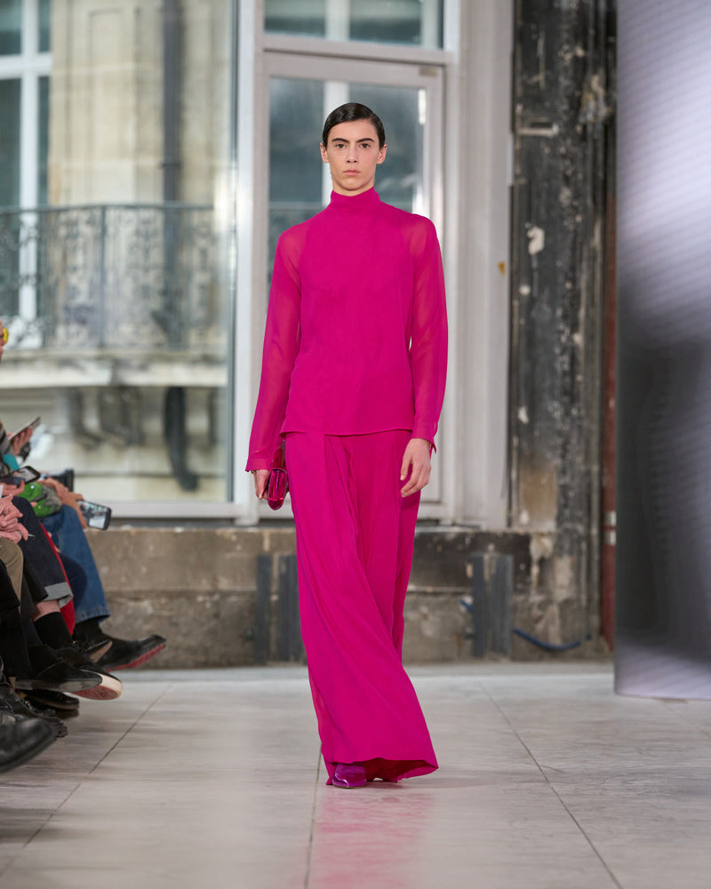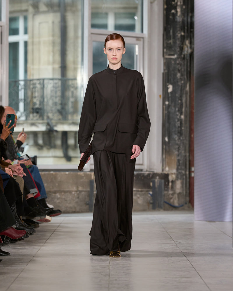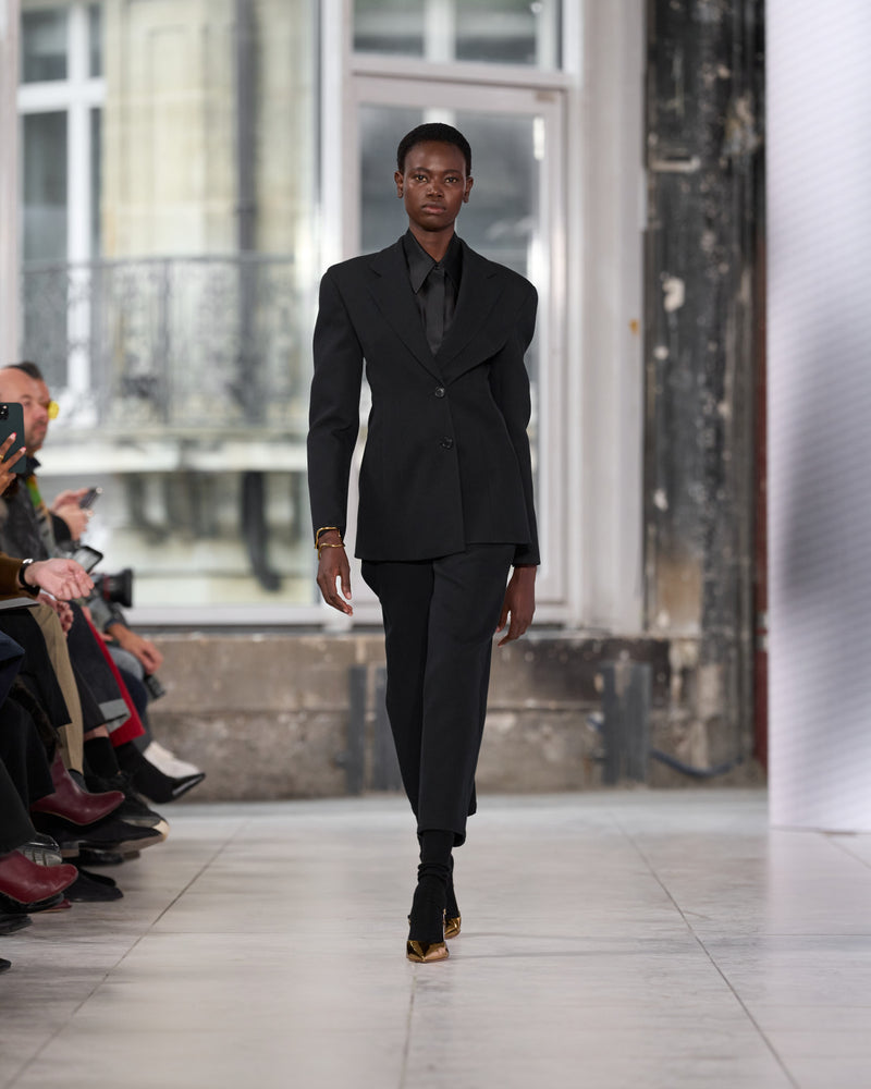Juxtaposed silhouettes. Tailored sharp and elongated. Volume shifting. Deep pockets, buttoned high – shirts give room for movement. The infinite pant creates fluidity between the woman, the garment, and the space around her. The tube dress, the sculpted blazer, the tapered pant.