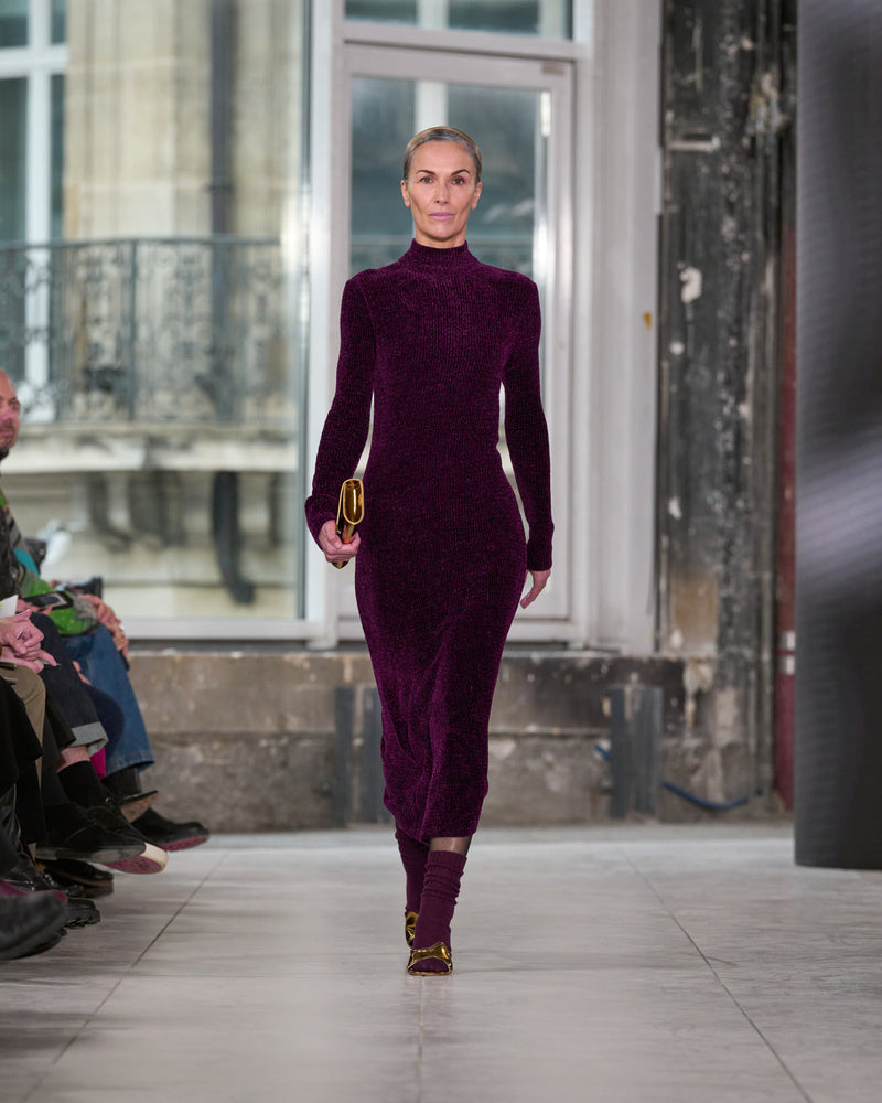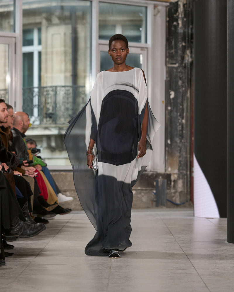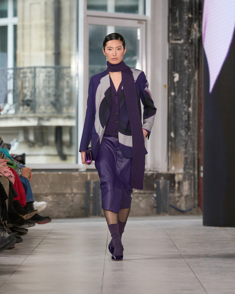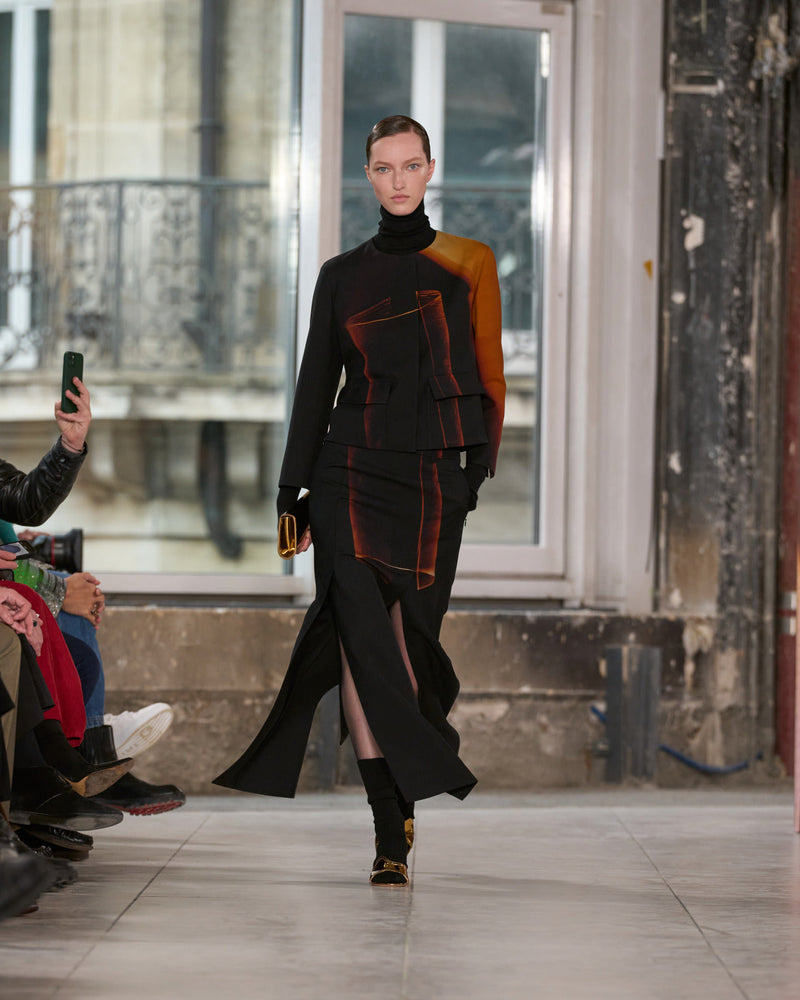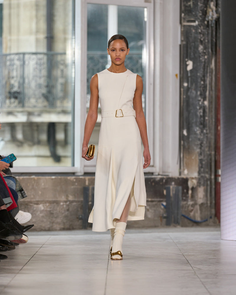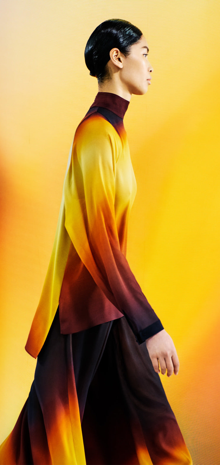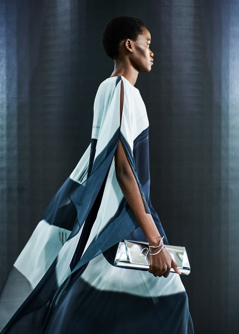 Juxtaposed silhouettes. Tailored sharp and elongated. Volume shifting. Deep pockets, buttoned high – shirts give room for movement. The infinite pant creates fluidity between the woman, the garment, and the space around her. The tube dress, the sculpted blazer, the tapered pant.