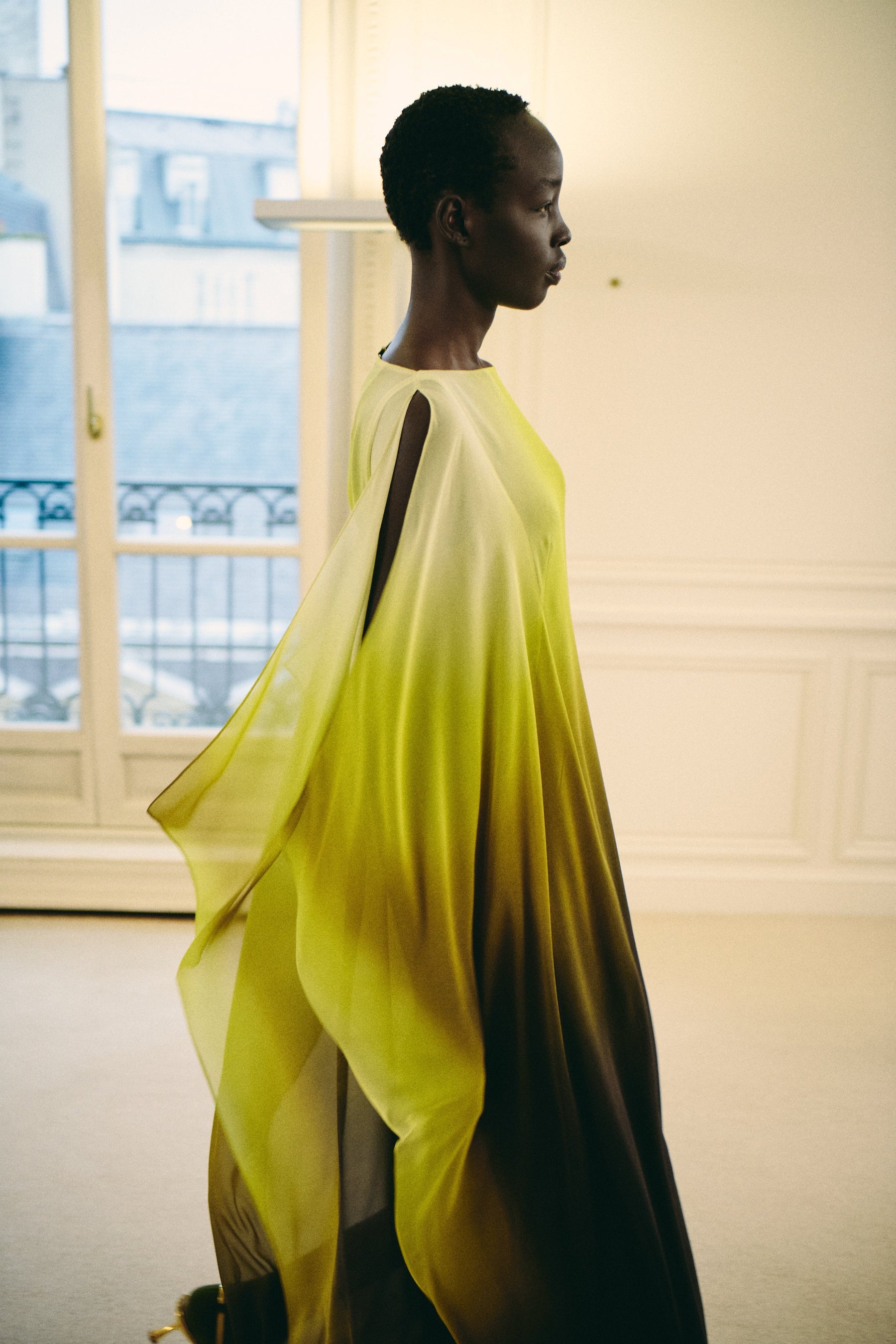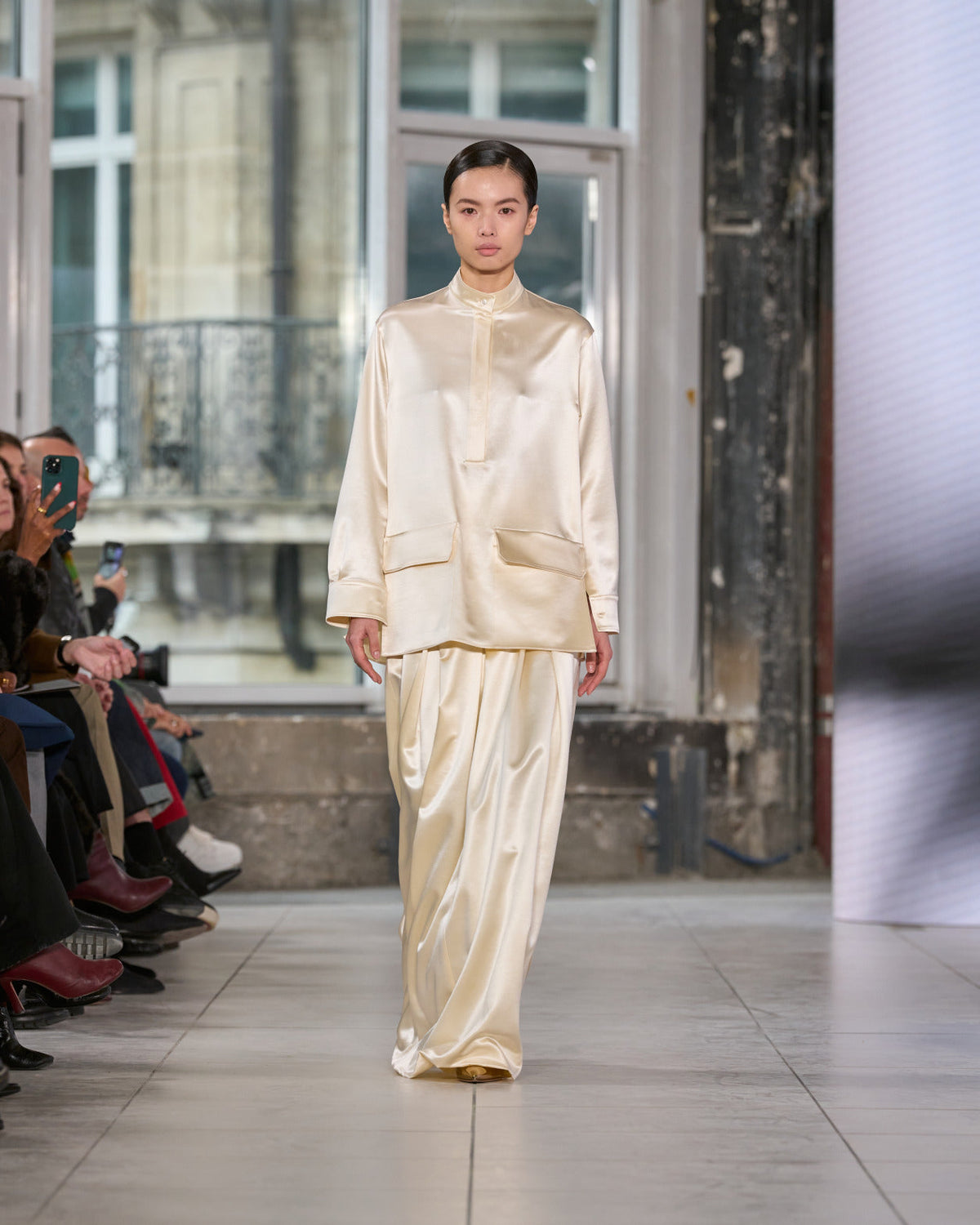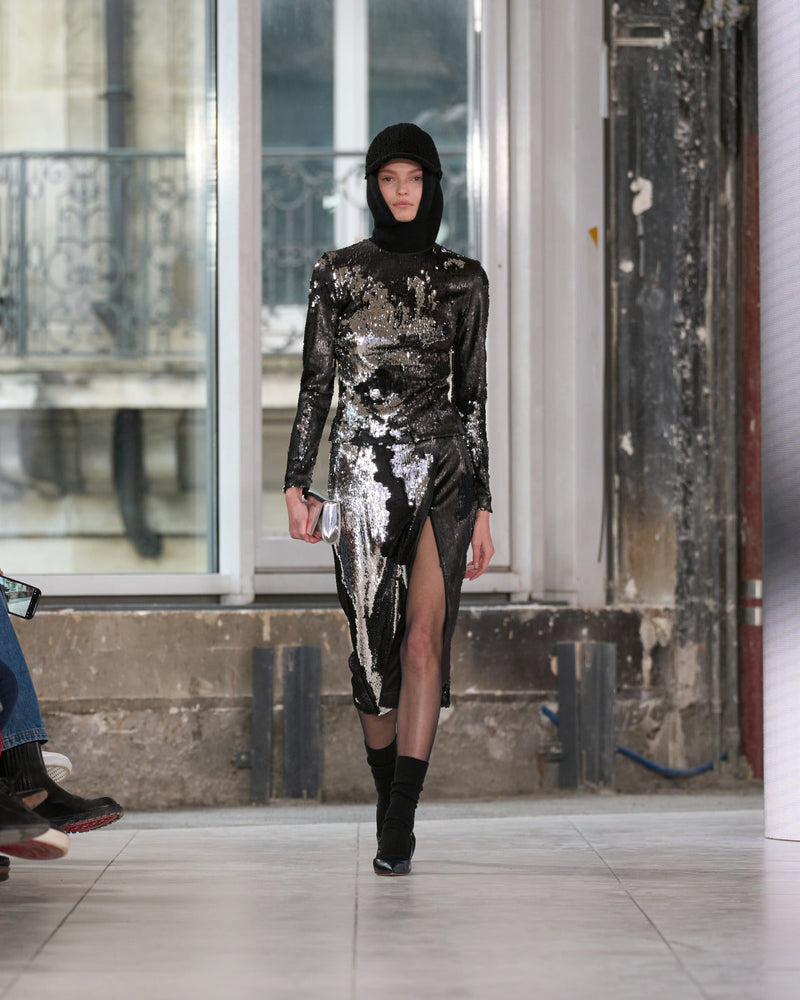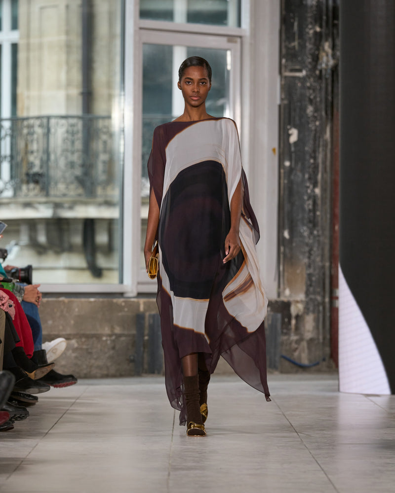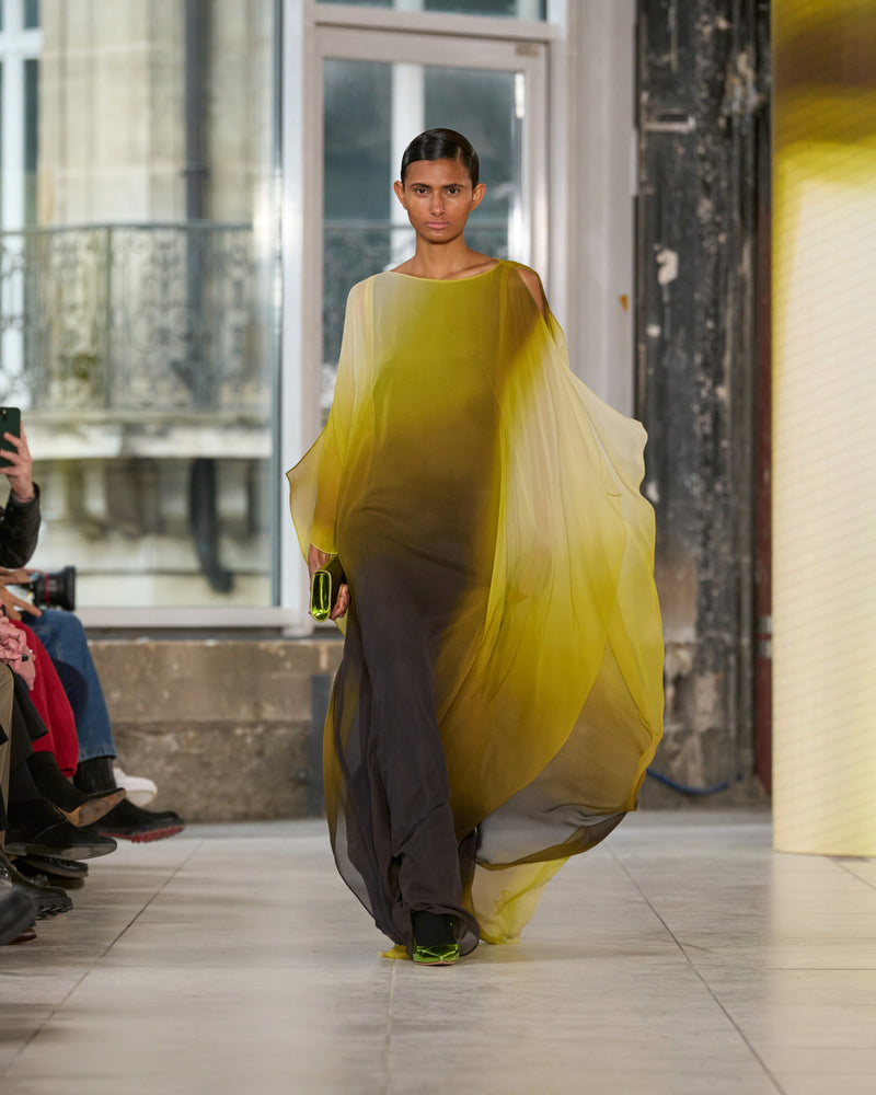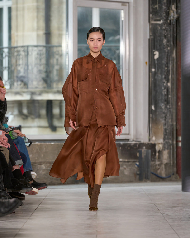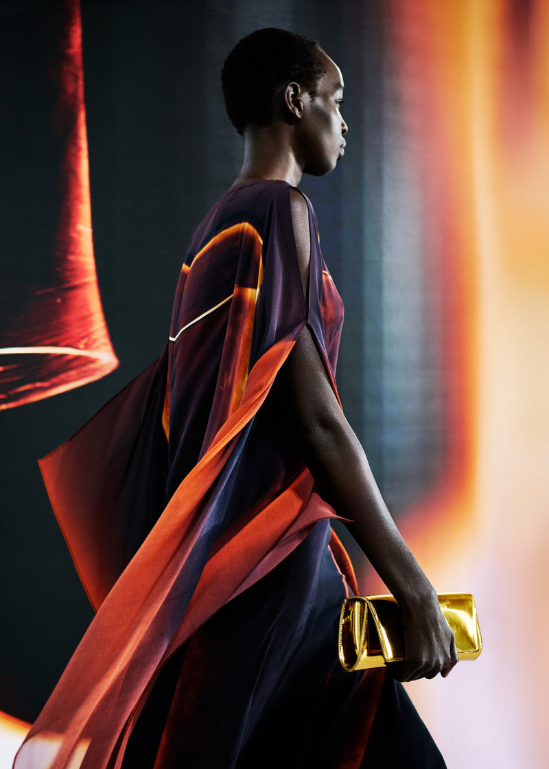 Juxtaposed silhouettes. Tailored sharp and elongated. Volume shifting. Deep pockets, buttoned high – shirts give room for movement. The infinite pant creates fluidity between the woman, the garment, and the space around her. The tube dress, the sculpted blazer, the tapered pant.