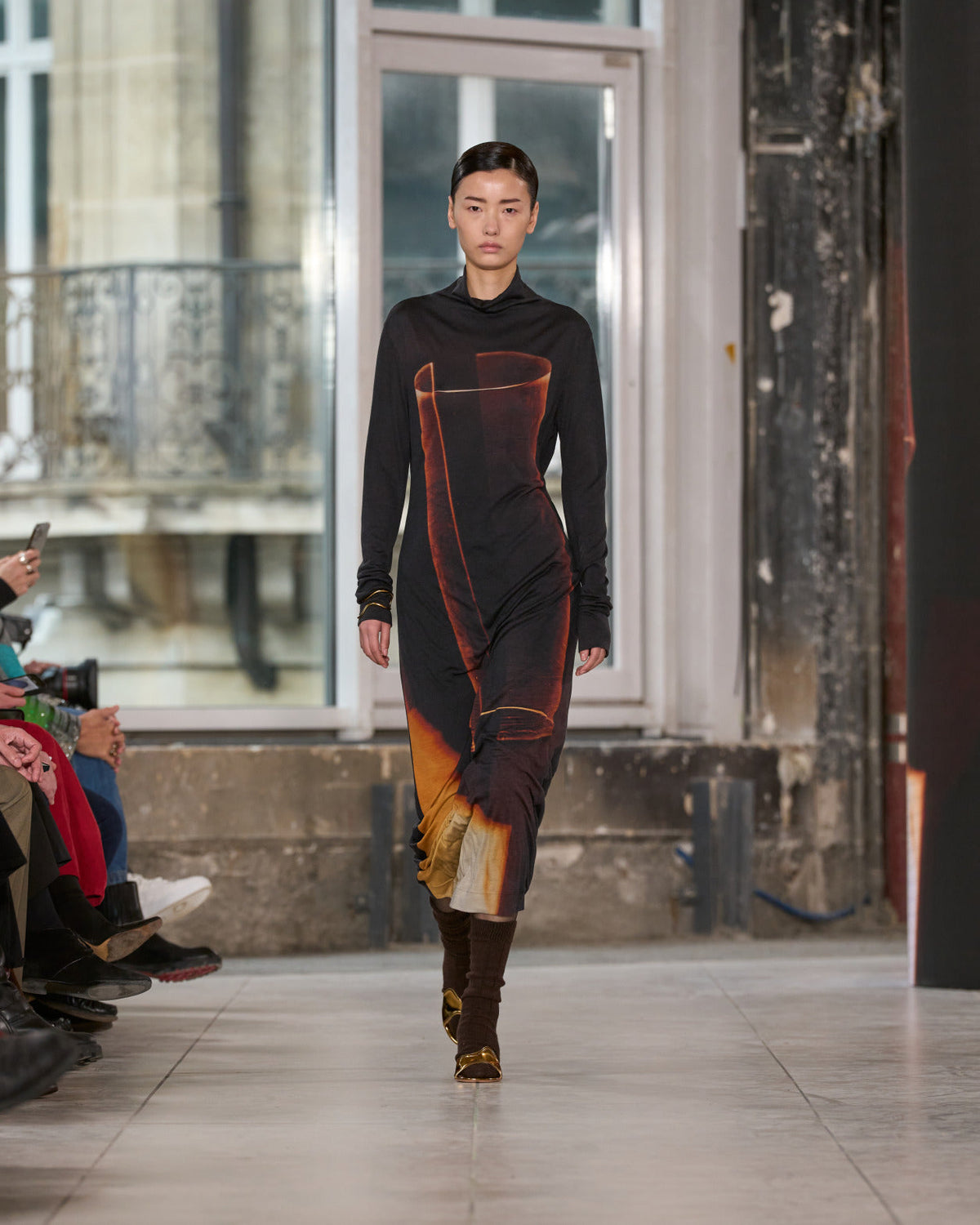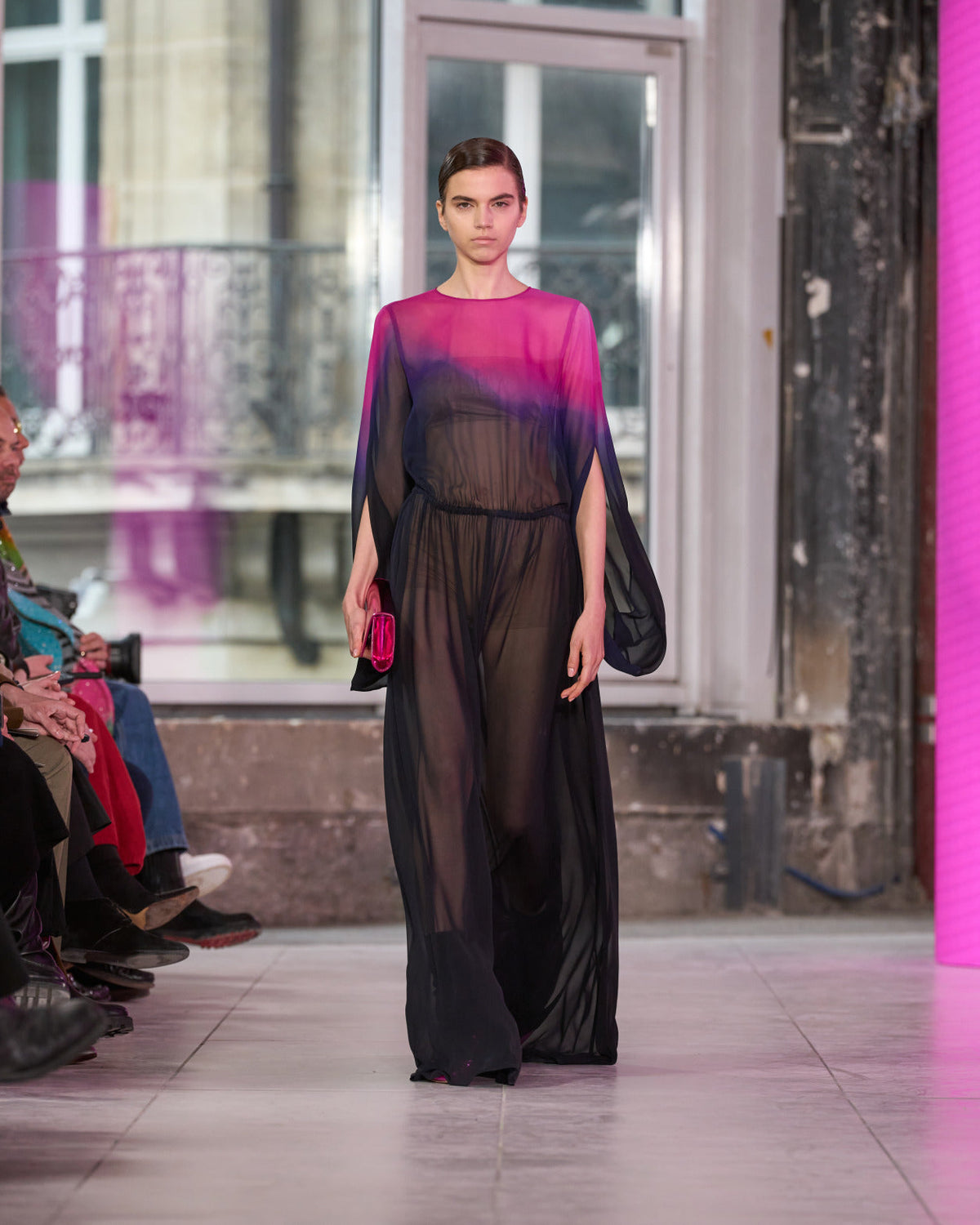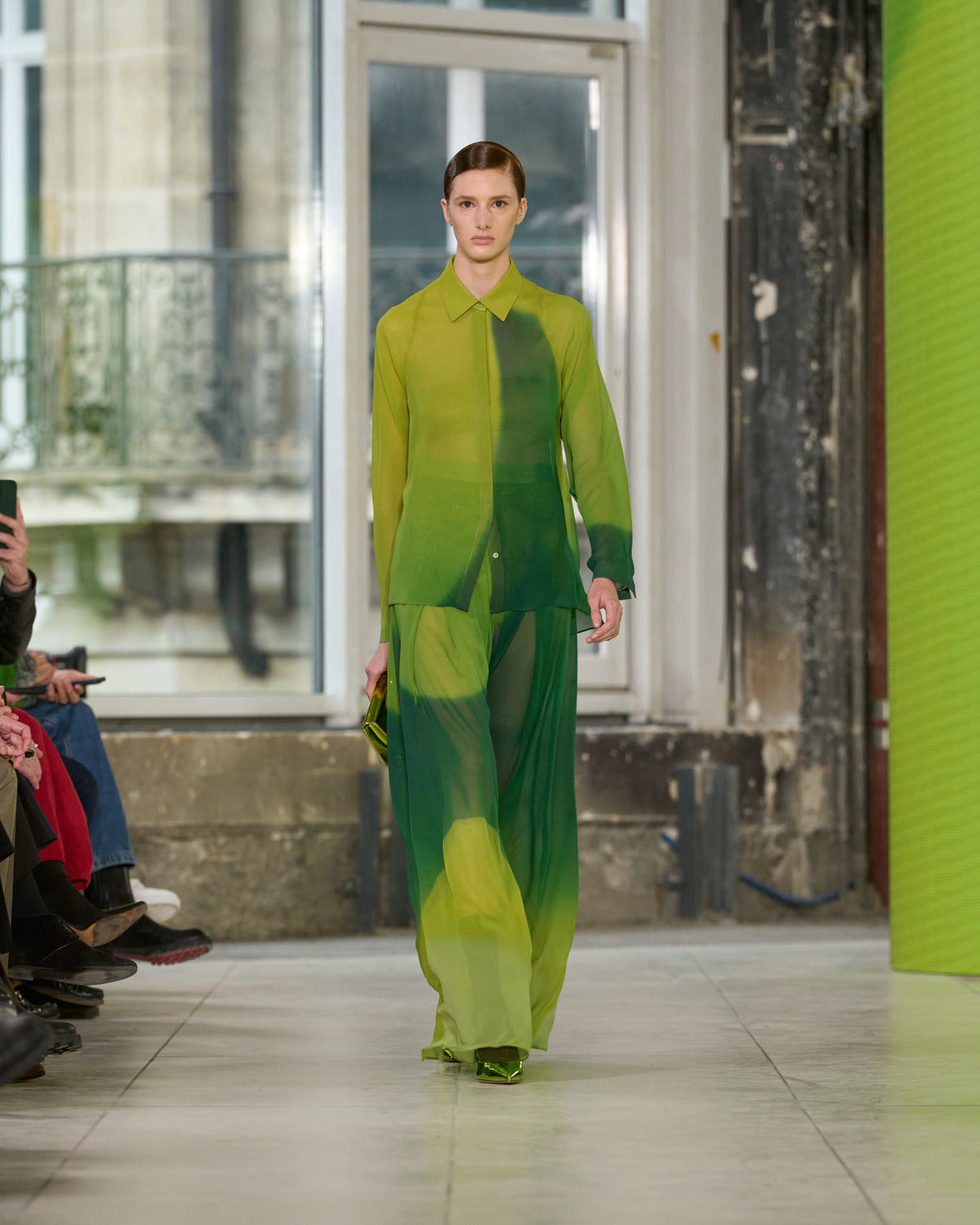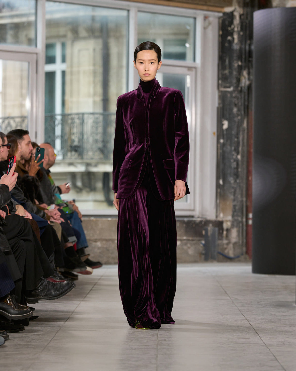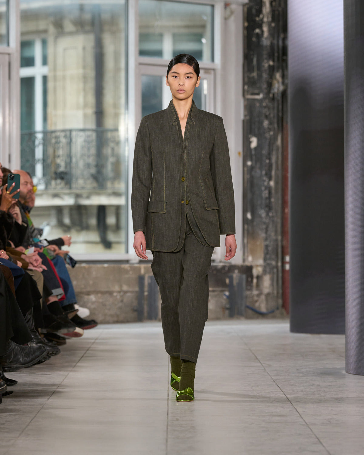 Juxtaposed silhouettes. Tailored sharp and elongated. Volume shifting. Deep pockets, buttoned high – shirts give room for movement. The infinite pant creates fluidity between the woman, the garment, and the space around her. The tube dress, the sculpted blazer, the tapered pant.